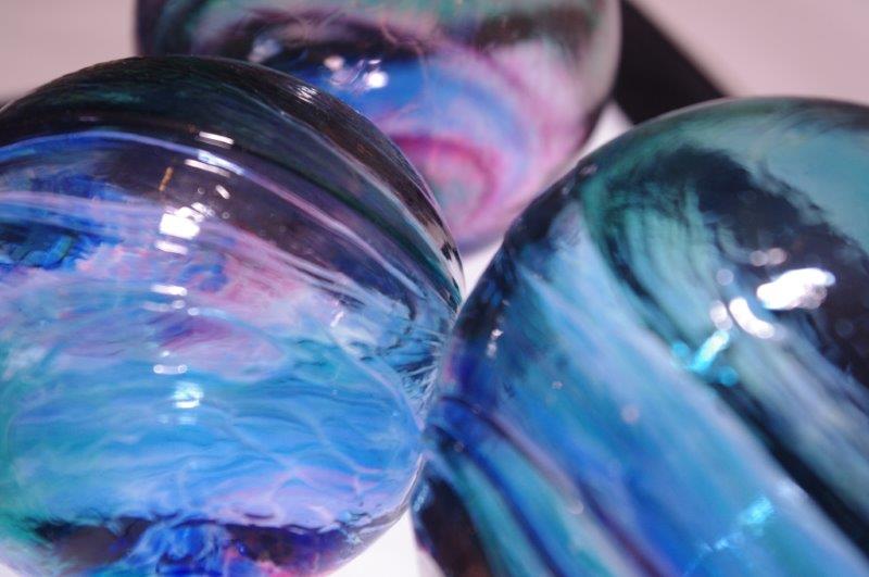 One of the attractions of making your own bauble is to choose your colours. Tim’s work glows with sumptious colours, red, blue, green, purple. The light shines through and brings them alive.